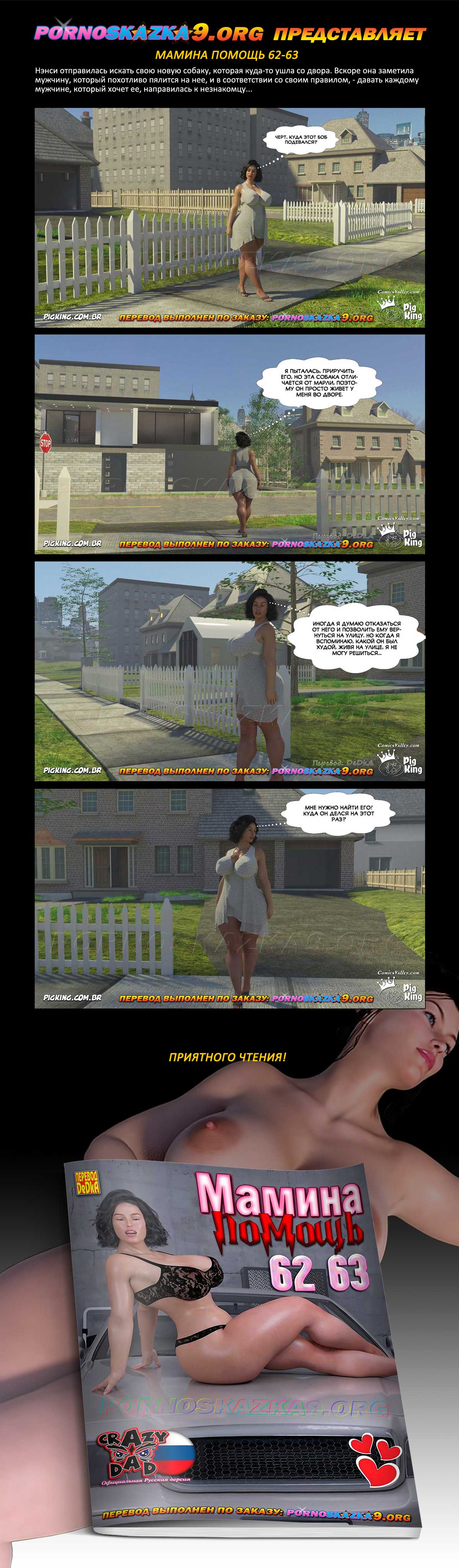 Порно комикс Мамина помощь. Части 62-63. Нэнси отправилась искать свою новую собаку, которая куда-то ушла со двора. Вскоре она заметила мужчину, который похотливо пялится на нее, и в соответствии со своим правилом, — давать каждому мужчине, который хочет ее, направилась к незнакомцу…